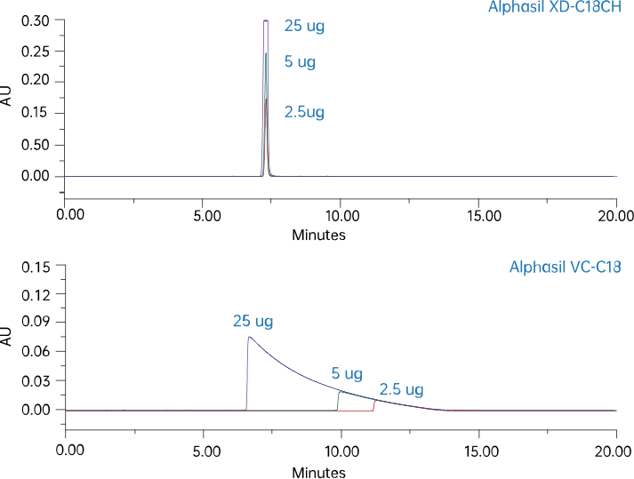 Alphasil XD-C18CH色譜柱通過在表面引入正電荷,有效屏蔽了堿性化合物與硅膠表面高能吸附位點之間的相互作用。在酸性色譜條件下,電離的堿性化合物與表面正電荷之間產生靜電排斥作用,從而顯著改善了堿性化合物的峰形,并提高了載樣量。