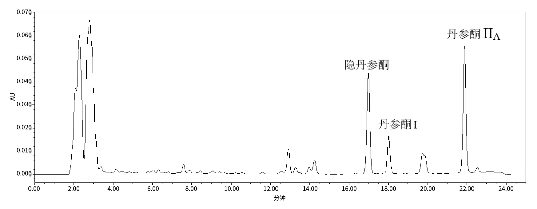 摘要:本文參照2020版《中國藥典》,采用全多孔色譜柱Alphasil VC-C18,對丹參供試品進行分析,結果顯示,丹參中目標峰峰形良好,隱丹參酮、丹參酮I的相對保留時間分別為0.78和0.82,丹參酮ⅡA目標峰理論塔板數大于60000,符合《中國藥典》要求。本方案可為丹參中丹參酮類的測定提供參考。