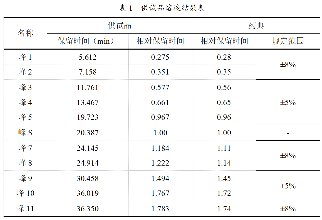 對參照物溶液及供試品溶液進行檢測,結果如下圖及表所示,根據結果可知,理論板數按橙皮苷峰計算為69052,滿足藥典理論板數按橙皮苷峰計算應不低于5000的要求,供試品色譜中呈現11個特征峰,各峰相對保留時間均可滿足藥典要求。