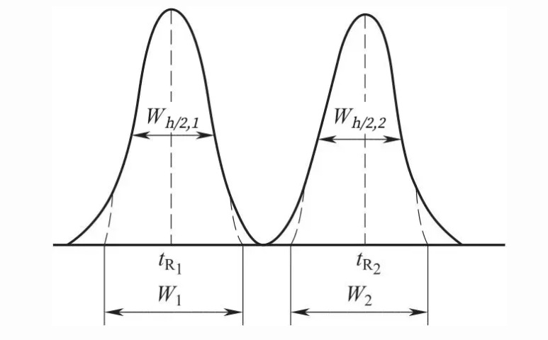 W1、W2 及、Wh/2,1、Wh/2,2 分別為此相鄰兩色譜峰的峰寬及半高峰寬。