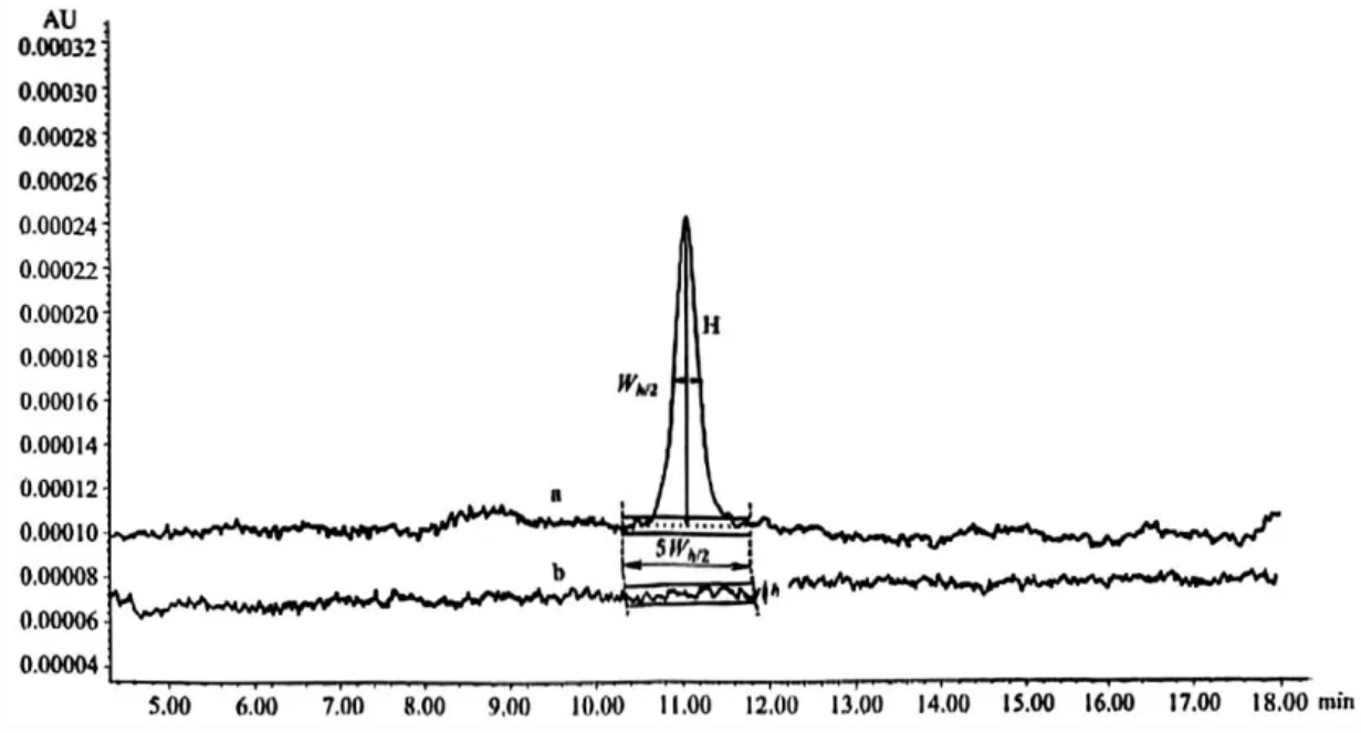 h 為使用空白溶液在參比溶液目標(biāo)峰至少 5 倍半高峰寬范圍內(nèi)觀察到的噪音幅度。